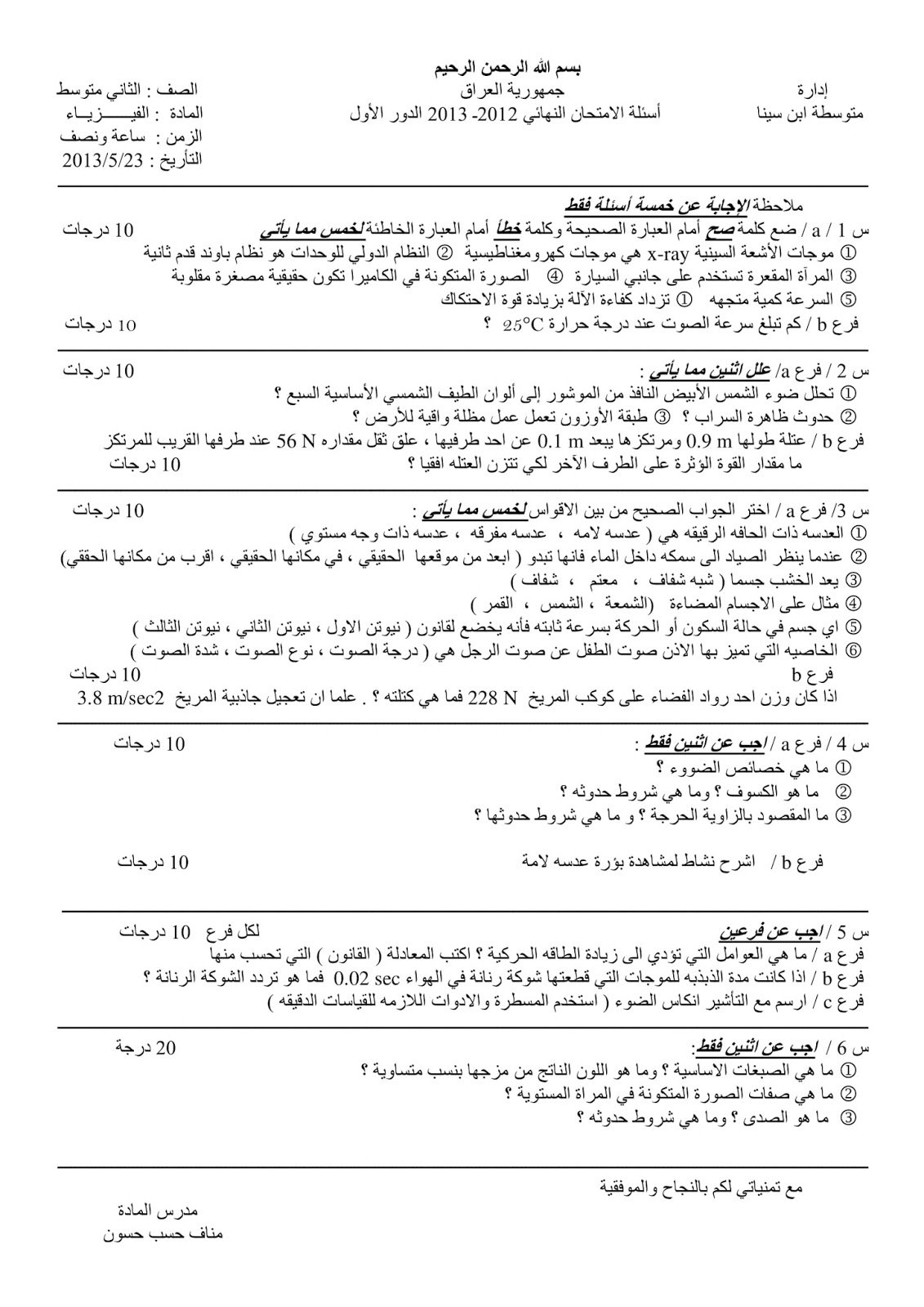 المدرس مناف حسب مجموعة من اسئلة الامتحان النهائي لمادة الفيزياء للصف الثاني المتوسط