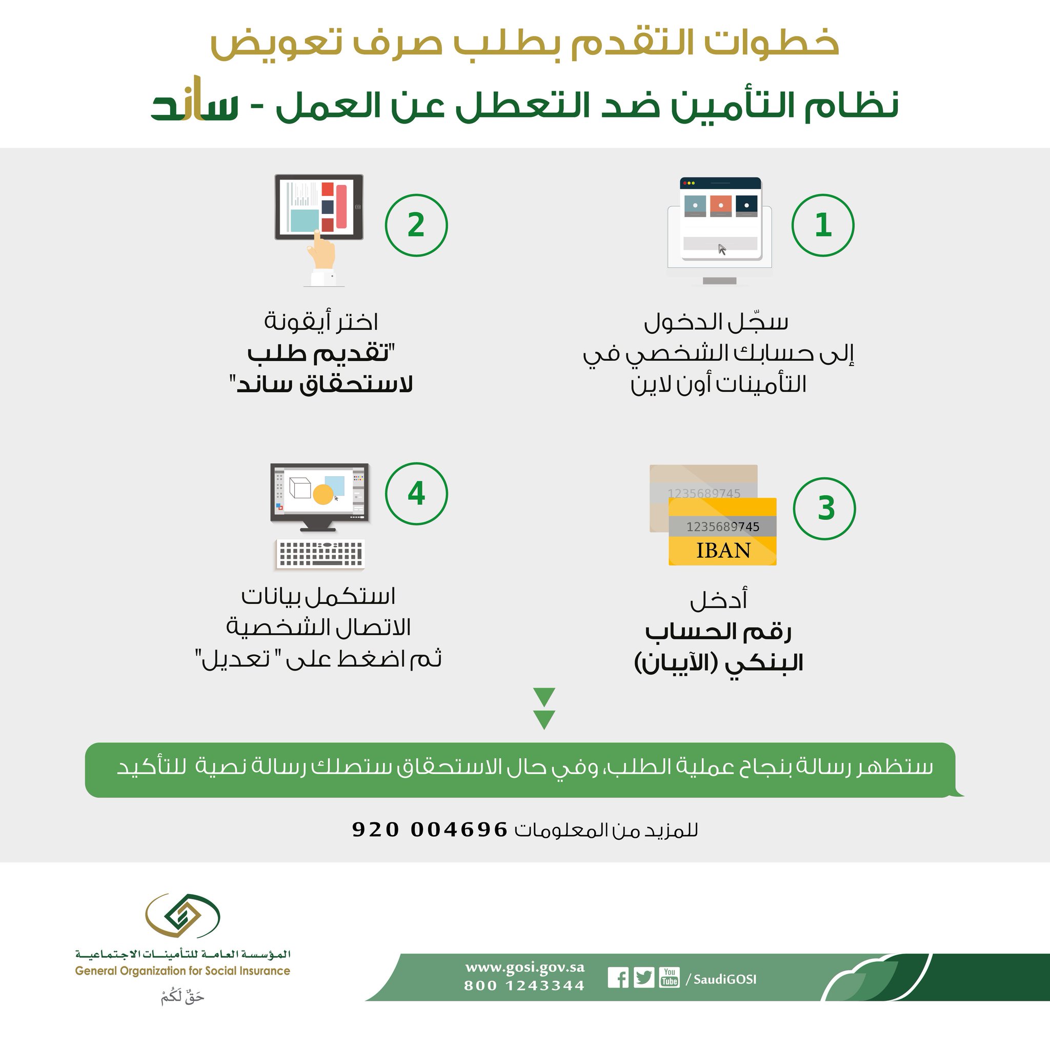 التقديم على ساند. قدم طلب لاستحقاق ساند. 2 في حال كان المشترك مؤهلا للتقديم على نظام ساند يجب عليه القيام بالدخول على حسابه الشخصي في التأمينات أون لاين ثم اتباع خطوات التقديم على تعويض ساند. وبهذا تكون قد انتهيت من خطوات طلب التقديم في نظام ساند وبعدها سوف يقوم النظام بإظهار رسالة أن عملية تقديم طلب تعويض تمت بنجاح وفي حال استحقاقك في أن تحصل على تعويض سوف يصلك رسالة نصية على هاتفك الجوال تفيد التأكيد. Your support id is.